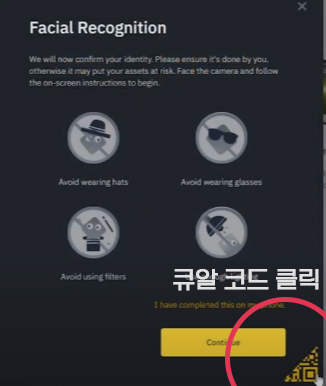 큐알 표시를 누르시면 큐알 코드가 뜨게 되며 이 큐알 코드를 모바일 바이낸스 앱에서 인식해 주시면